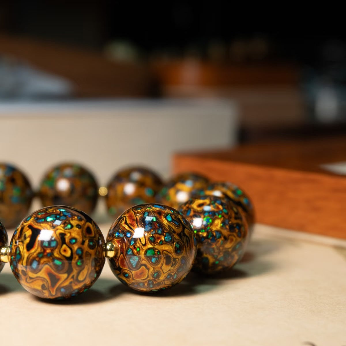 Each bead is coated with natural lacquer up to 30 times, polished between each layer, and cured for weeks. This ancient process takes over 60 days to complete.
